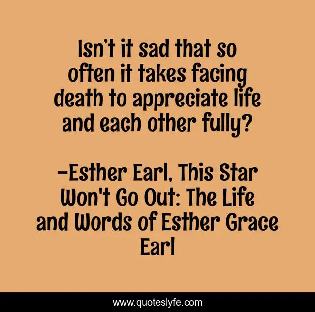 This page presents the quote "Isn’t it sad that so often it takes facing death to appreciate life and each other fully?". Author of this quote is Esther Earl, This Star Won't Go Out: The Life and Words of Esther Grace Earl. This quote is about life, death, sadness,.