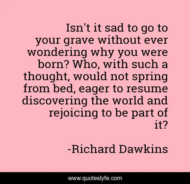 This page presents the quote "Isn't it sad to go to your grave without ever wondering why you were born? Who, with such a thought, would not spring from bed, eager to resume discovering the world and rejoicing to be part of it?". Author of this quote is Richard Dawkins. This quote is about thought, world, spring,.