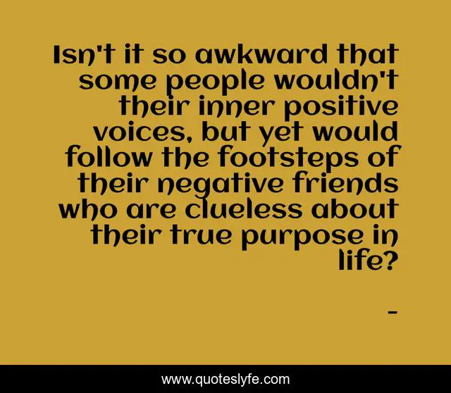 This page presents the quote "Isn't it so awkward that some people wouldn't their inner positive voices, but yet would follow the footsteps of their negative friends who are clueless about their true purpose in life?". Author of this quote is . This quote is about edmond-mbiaka, negative-friends, inner-voices, inner-positive-voices, your-true-purpose-in-life,.