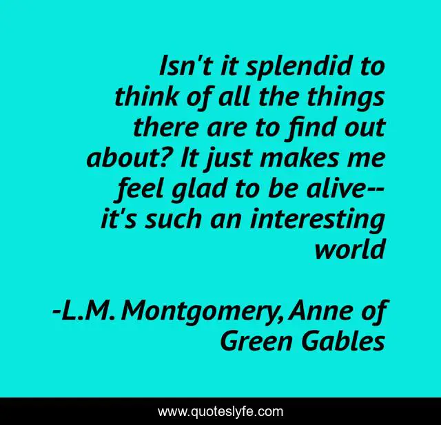 This page presents the quote "Isn't it splendid to think of all the things there are to find out about? It just makes me feel glad to be alive--it's such an interesting world". Author of this quote is L.M. Montgomery, Anne of Green Gables. This quote is about anne-of-green-gables, learning, anne-shirley,.