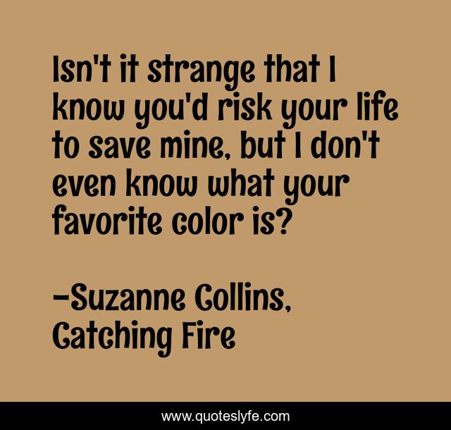 This page presents the quote "Isn't it strange that I know you'd risk your life to save mine, but I don't even know what your favorite color is?". Author of this quote is Suzanne Collins, Catching Fire. This quote is about color, life, humor,.