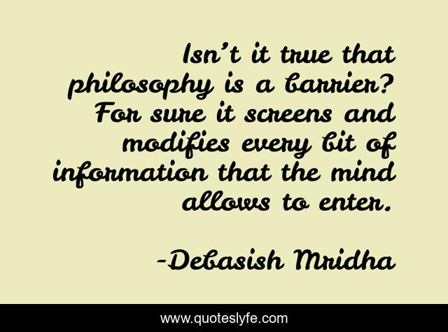 This page presents the quote "Isn’t it true that philosophy is a barrier? For sure it screens and modifies every bit of information that the mind allows to enter.". Author of this quote is Debasish Mridha. This quote is about philosophy, information-that-enters-the-mind, debasish-mridha, debasish-mridha-m-d, quotes, inspirational, enthusiasm, effect-of-philosophy,.