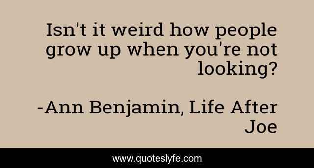 This page presents the quote "Isn't it weird how people grow up when you're not looking?". Author of this quote is Ann Benjamin, Life After Joe. This quote is about growing-old, growing-up,.