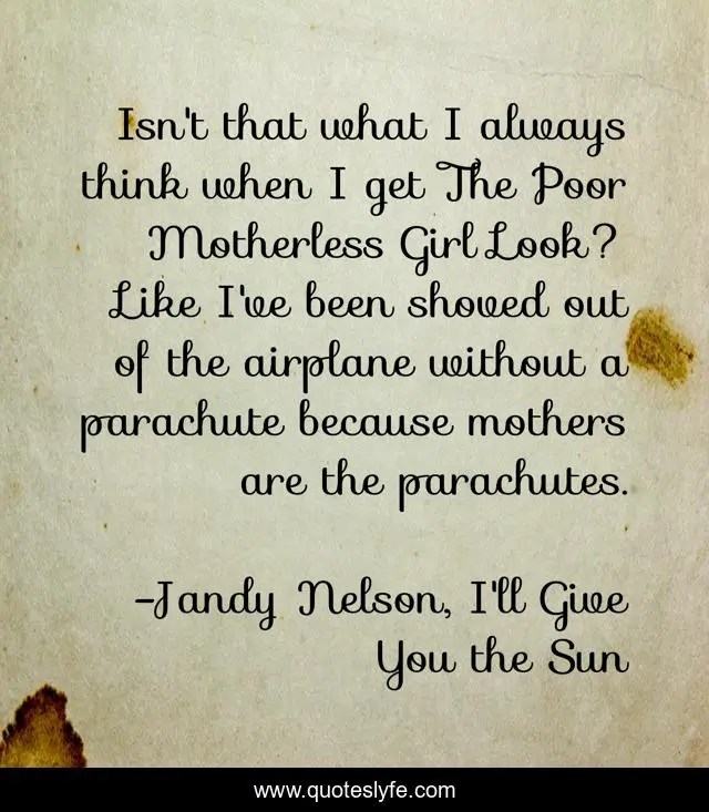 This page presents the quote "Isn't that what I always think when I get The Poor Motherless Girl Look? Like I've been shoved out of the airplane without a parachute because mothers are the parachutes.". Author of this quote is Jandy Nelson, I'll Give You the Sun. .
