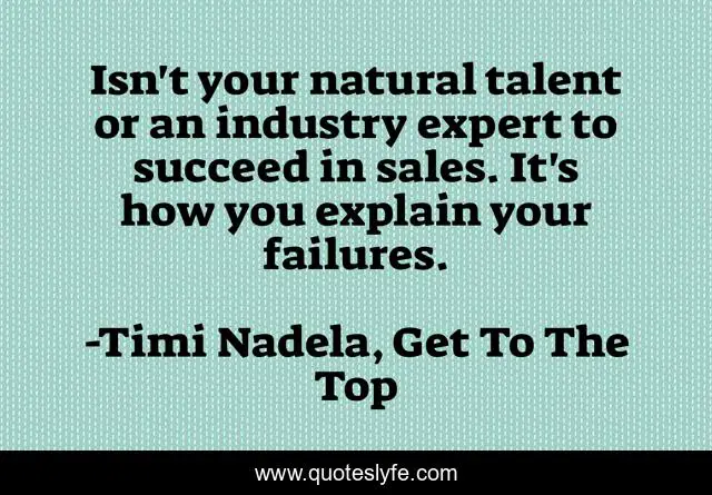 This page presents the quote "Isn't your natural talent or an industry expert to succeed in sales. It's how you explain your failures.". Author of this quote is Timi Nadela, Get To The Top. This quote is about sales-tips, sales-effectiveness, sales,.