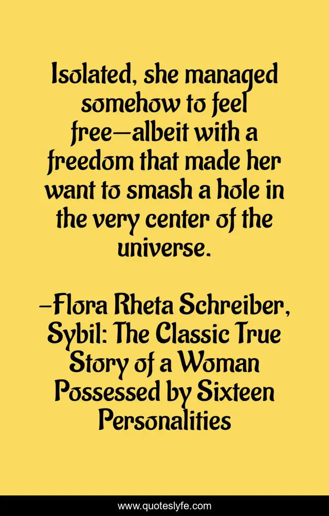 This page presents the quote "Isolated, she managed somehow to feel free—albeit with a freedom that made her want to smash a hole in the very center of the universe.". Author of this quote is Flora Rheta Schreiber, Sybil: The Classic True Story of a Woman Possessed by Sixteen Personalities. .