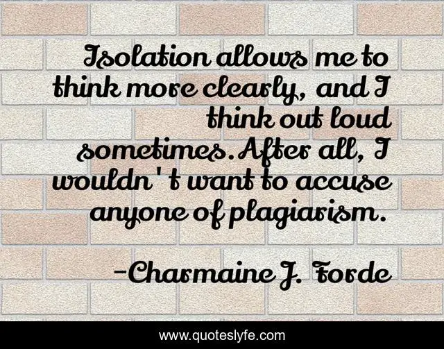 This page presents the quote "Isolation allows me to think more clearly, and I think out loud sometimes.After all, I wouldn't want to accuse anyone of plagiarism.". Author of this quote is Charmaine J. Forde. This quote is about afterall, isolation, clearly, plagiarism, accuse, think,.