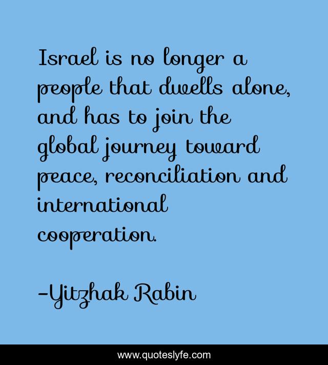 This page presents the quote "Israel is no longer a people that dwells alone, and has to join the global journey toward peace, reconciliation and international cooperation.". Author of this quote is Yitzhak Rabin. This quote is about alone, journey, people,.