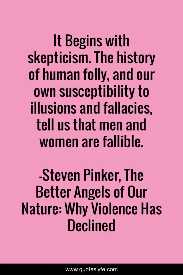 This page presents the quote "It Begins with skepticism. The history of human folly, and our own susceptibility to illusions and fallacies, tell us that men and women are fallible.". Author of this quote is Steven Pinker, The Better Angels of Our Nature: Why Violence Has Declined. This quote is about science, skepticism,.