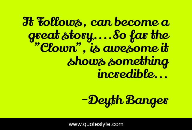 This page presents the quote "It Follows, can become a great story....So far the "Clown", is awesome it shows something incredible...". Author of this quote is Deyth Banger. This quote is about follows, follow, great, story, incredible,.