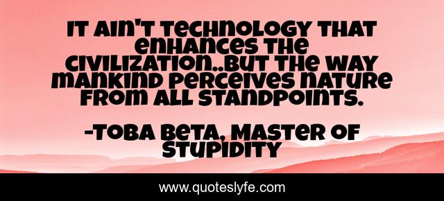 This page presents the quote "It ain't technology that enhances the civilization..but the way mankind perceives nature from all standpoints.". Author of this quote is Toba Beta, Master of Stupidity. This quote is about civilization, technology, perception,.
