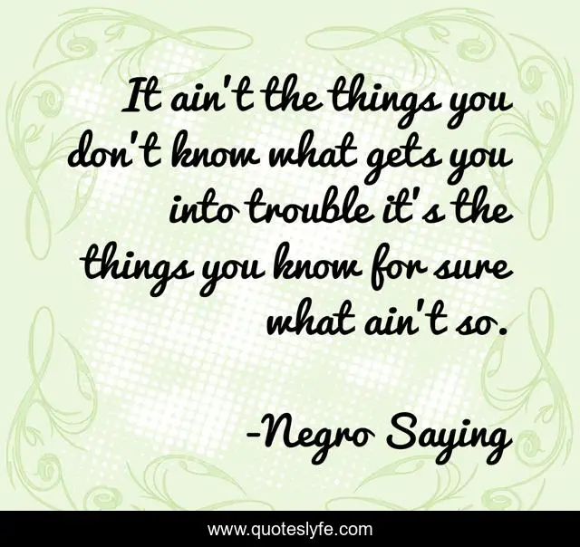 This page presents the quote "It ain't the things you don't know what gets you into trouble it's the things you know for sure what ain't so.". Author of this quote is Negro Saying. .