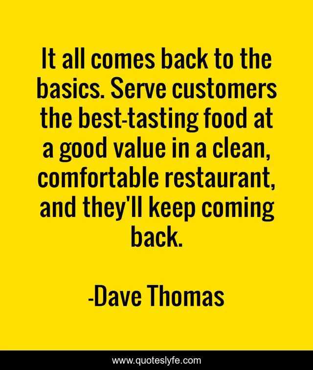 This page presents the quote "It all comes back to the basics. Serve customers the best-tasting food at a good value in a clean, comfortable restaurant, and they'll keep coming back.". Author of this quote is Dave Thomas. This quote is about good, value, restaurant,.