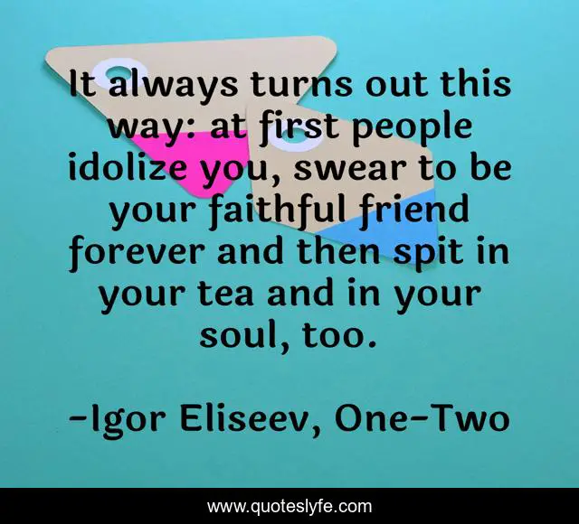 This page presents the quote "It always turns out this way: at first people idolize you, swear to be your faithful friend forever and then spit in your tea and in your soul, too.". Author of this quote is Igor Eliseev, One-Two. This quote is about faith, life, two-souls, experience, dramatic-moment, drama, philosophical, inspirational, enthusiasm,.