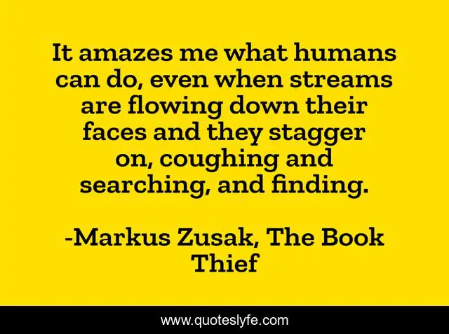 This page presents the quote "It amazes me what humans can do, even when streams are flowing down their faces and they stagger on, coughing and searching, and finding.". Author of this quote is Markus Zusak, The Book Thief. .