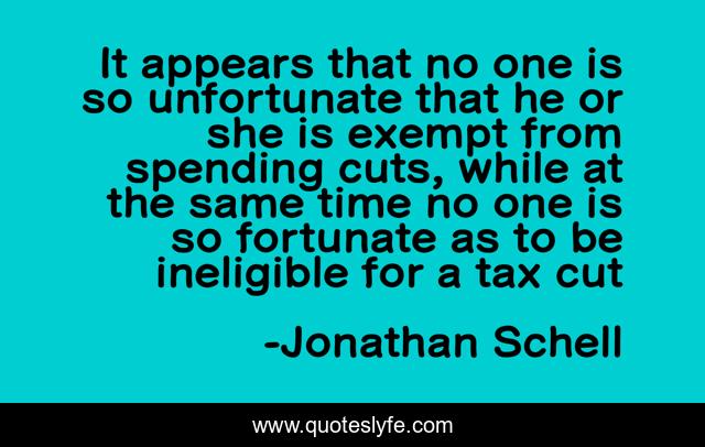 This page presents the quote "It appears that no one is so unfortunate that he or she is exempt from spending cuts, while at the same time no one is so fortunate as to be ineligible for a tax cut". Author of this quote is Jonathan Schell. This quote is about justice, politics, cruelty,.