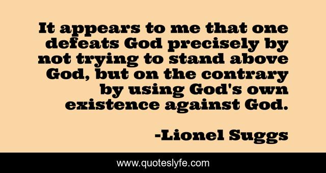 This page presents the quote "It appears to me that one defeats God precisely by not trying to stand above God, but on the contrary by using God's own existence against God.". Author of this quote is Lionel Suggs. This quote is about victory, existence-of-god,.