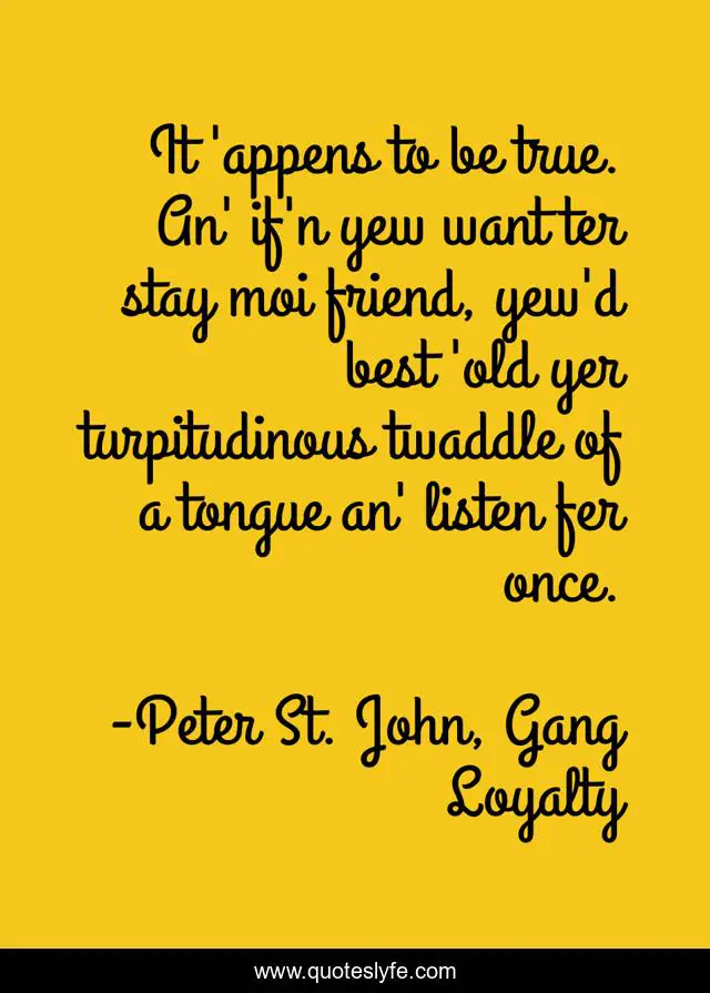 This page presents the quote "It 'appens to be true. An' if'n yew want ter stay moi friend, yew'd best 'old yer turpitudinous twaddle of a tongue an' listen fer once.". Author of this quote is Peter St. John, Gang Loyalty. This quote is about wisdom-in-fiction, female-hero, tongue, listening,.