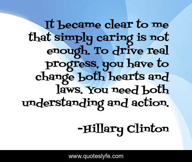 This page presents the quote "It became clear to me that simply caring is not enough. To drive real progress, you have to change both hearts and laws. You need both understanding and action.". Author of this quote is Hillary Clinton. This quote is about caring, progress, me,.