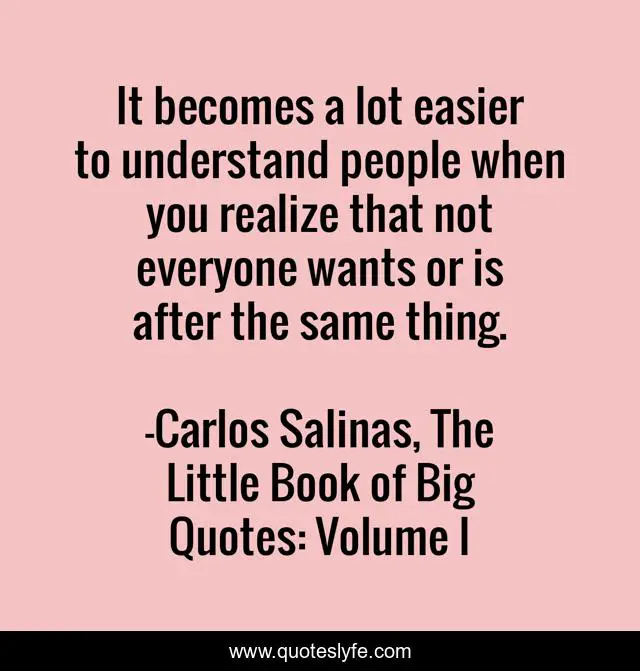 This page presents the quote "It becomes a lot easier to understand people when you realize that not everyone wants or is after the same thing.". Author of this quote is Carlos Salinas, The Little Book of Big Quotes: Volume I. This quote is about relationships, life, love, confidence, positive, motivational, wise-words, understanding, quotes,.