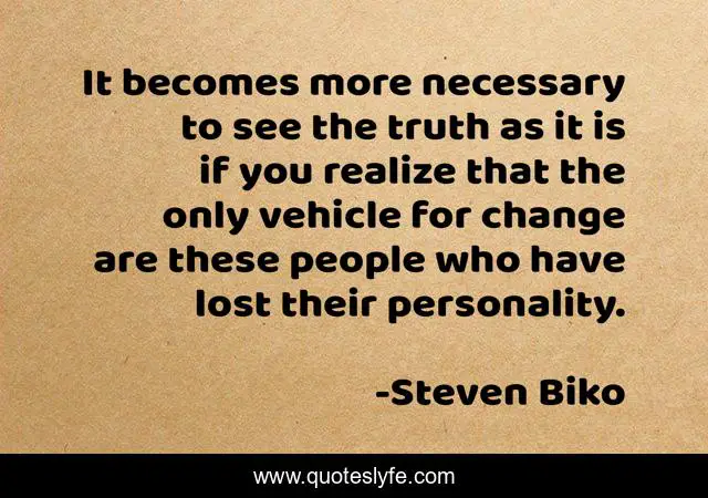 This page presents the quote "It becomes more necessary to see the truth as it is if you realize that the only vehicle for change are these people who have lost their personality.". Author of this quote is Steven Biko. This quote is about change, lost, personality,.