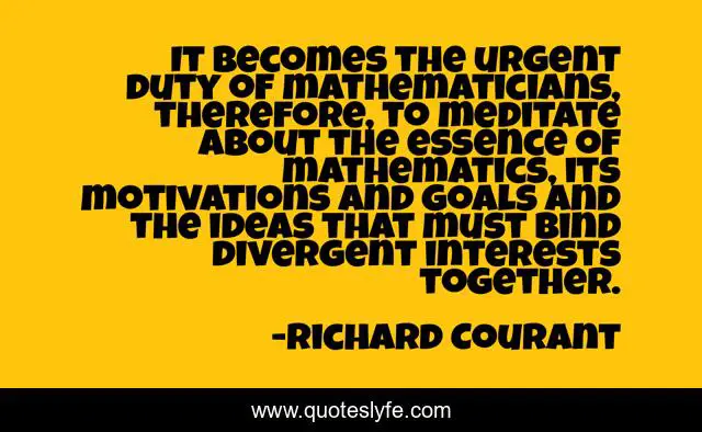 This page presents the quote "It becomes the urgent duty of mathematicians, therefore, to meditate about the essence of mathematics, its motivations and goals and the ideas that must bind divergent interests together.". Author of this quote is Richard Courant. This quote is about duty, interests, motivation, goal, science, mathematics, math,.