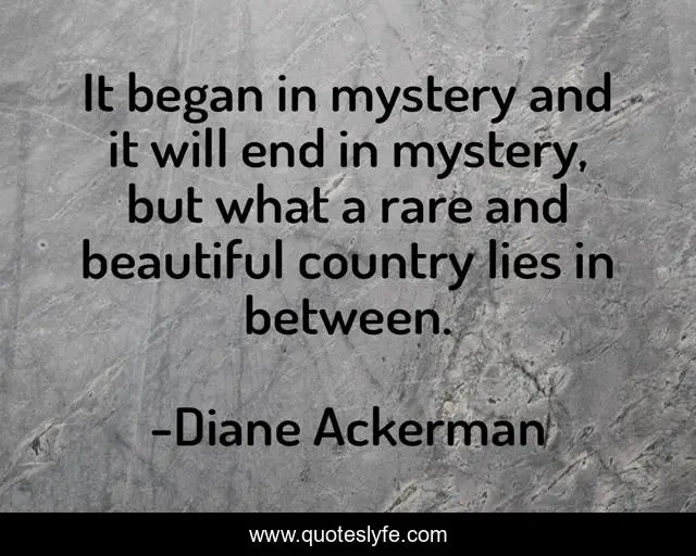 This page presents the quote "It began in mystery and it will end in mystery, but what a rare and beautiful country lies in between.". Author of this quote is Diane Ackerman. .