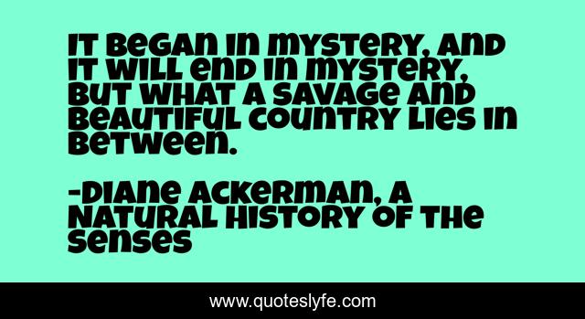 This page presents the quote "It began in mystery, and it will end in mystery, but what a savage and beautiful country lies in between.". Author of this quote is Diane Ackerman, A Natural History of the Senses. This quote is about mystery, mysteries,.