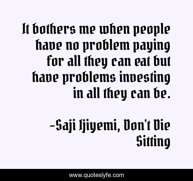 This page presents the quote "It bothers me when people have no problem paying for all they can eat but have problems investing in all they can be.". Author of this quote is Saji Ijiyemi, Don't Die Sitting. This quote is about success, personal-growth, life-improvement, self-improvement, learning, personal-development, investment,.