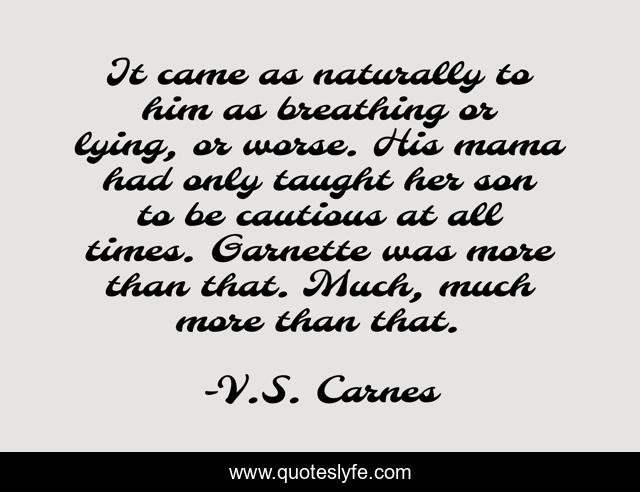 This page presents the quote "It came as naturally to him as breathing or lying, or worse. His mama had only taught her son to be cautious at all times. Garnette was more than that. Much, much more than that.". Author of this quote is V.S. Carnes. This quote is about lie, espionage,.
