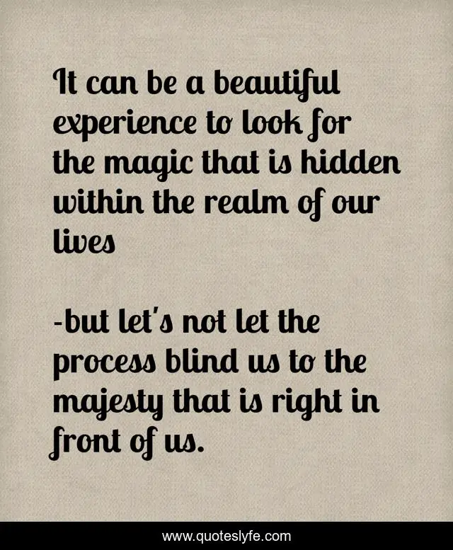 This page presents the quote "It can be a beautiful experience to look for the magic that is hidden within the realm of our lives". Author of this quote is but let's not let the process blind us to the majesty that is right in front of us.. .