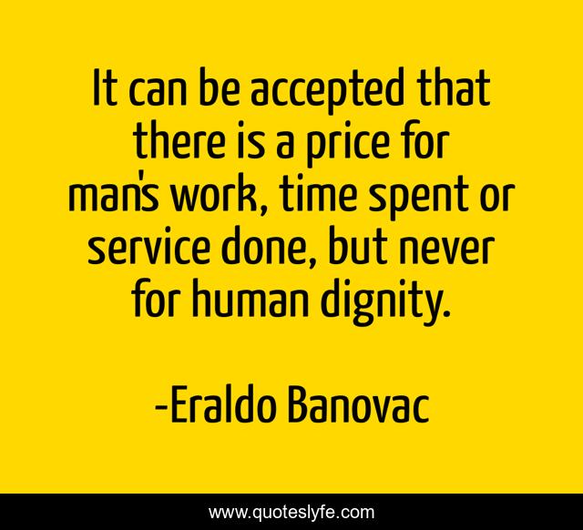 This page presents the quote "It can be accepted that there is a price for man's work, time spent or service done, but never for human dignity.". Author of this quote is Eraldo Banovac. This quote is about confidence, philosophy, inspirational, positive, price, motivational, sociology, optimistic, time-spent,.