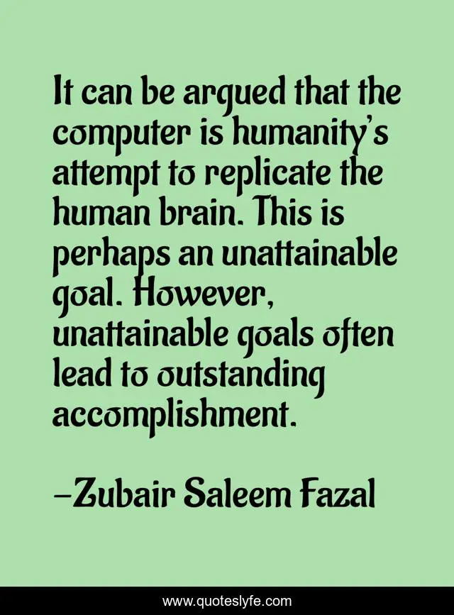 This page presents the quote "It can be argued that the computer is humanity’s attempt to replicate the human brain. This is perhaps an unattainable goal. However, unattainable goals often lead to outstanding accomplishment.". Author of this quote is Zubair Saleem Fazal. This quote is about computer-science, computers, technology, humanity,.