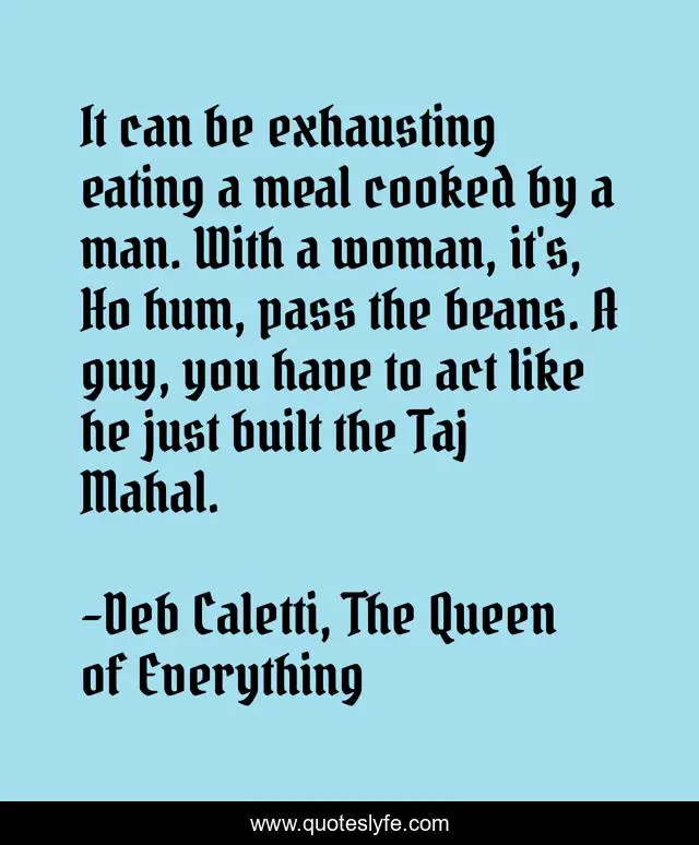 This page presents the quote "It can be exhausting eating a meal cooked by a man. With a woman, it's, Ho hum, pass the beans. A guy, you have to act like he just built the Taj Mahal.". Author of this quote is Deb Caletti, The Queen of Everything. This quote is about appreciation, cooking, humor, gender-stereotypes,.