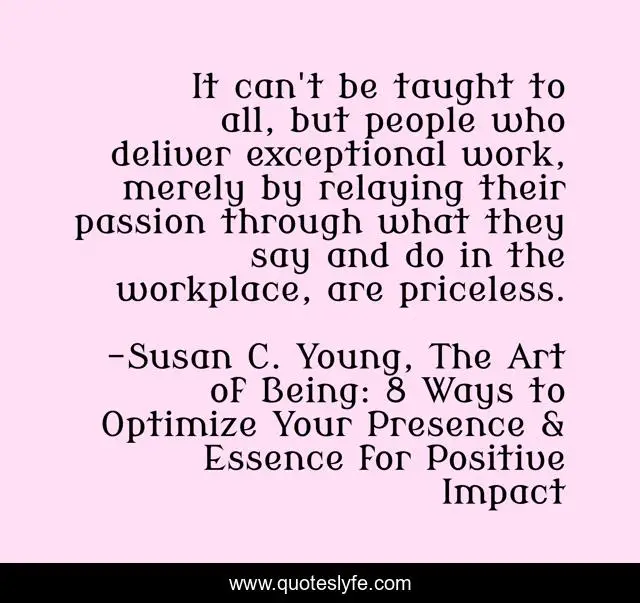 This page presents the quote "It can't be taught to all, but people who deliver exceptional work, merely by relaying their passion through what they say and do in the workplace, are priceless.". Author of this quote is Susan C. Young, The Art of Being: 8 Ways to Optimize Your Presence & Essence for Positive Impact. This quote is about confidence, susan-young, relationship, communication-skills, passionate-living, communication, first-impressions, authenticity, integrity,.