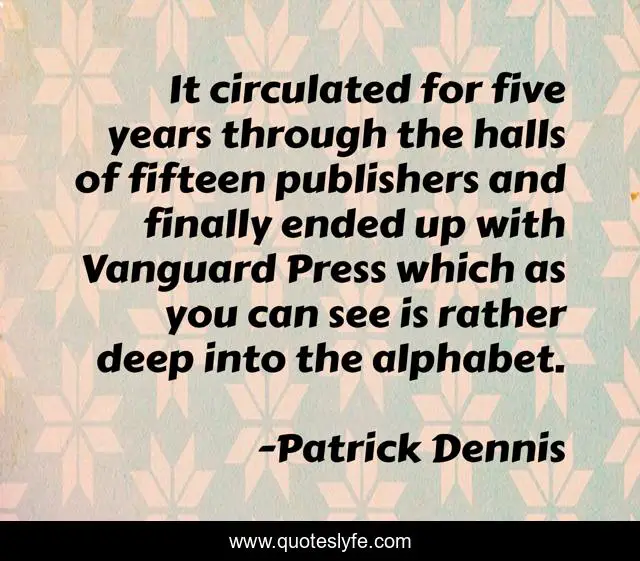 This page presents the quote "It circulated for five years through the halls of fifteen publishers and finally ended up with Vanguard Press which as you can see is rather deep into the alphabet.". Author of this quote is Patrick Dennis. This quote is about books, reading,.