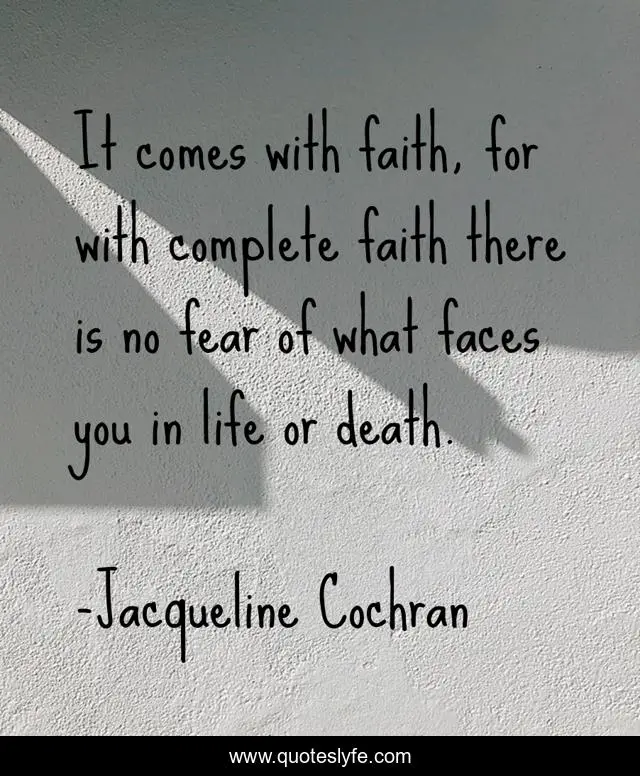 This page presents the quote "It comes with faith, for with complete faith there is no fear of what faces you in life or death.". Author of this quote is Jacqueline Cochran. This quote is about faith, life, fear,.