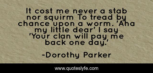 This page presents the quote "It cost me never a stab nor squirm To tread by chance upon a worm. 'Aha my little dear' I say 'Your clan will pay me back one day.'". Author of this quote is Dorothy Parker. This quote is about death, dying,.