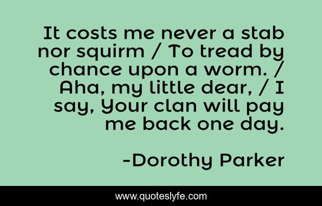 This page presents the quote "It costs me never a stab nor squirm / To tread by chance upon a worm. / Aha, my little dear, / I say, Your clan will pay me back one day.". Author of this quote is Dorothy Parker. This quote is about awesome-women, humor, poetry,.