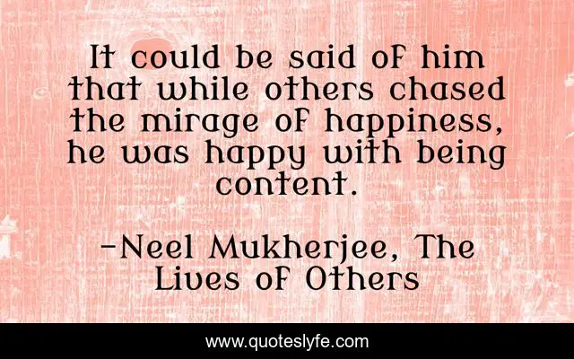 This page presents the quote "It could be said of him that while others chased the mirage of happiness, he was happy with being content.". Author of this quote is Neel Mukherjee, The Lives of Others. This quote is about simplicity, pursuit-of-happiness, life-lessons, simplicity-in-life, life-and-living, happiness,.