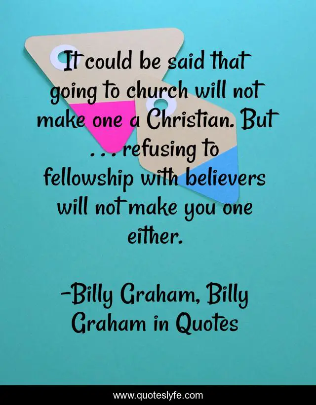 This page presents the quote "It could be said that going to church will not make one a Christian. But . . . refusing to fellowship with believers will not make you one either.". Author of this quote is Billy Graham, Billy Graham in Quotes. This quote is about billy-graham, church,.