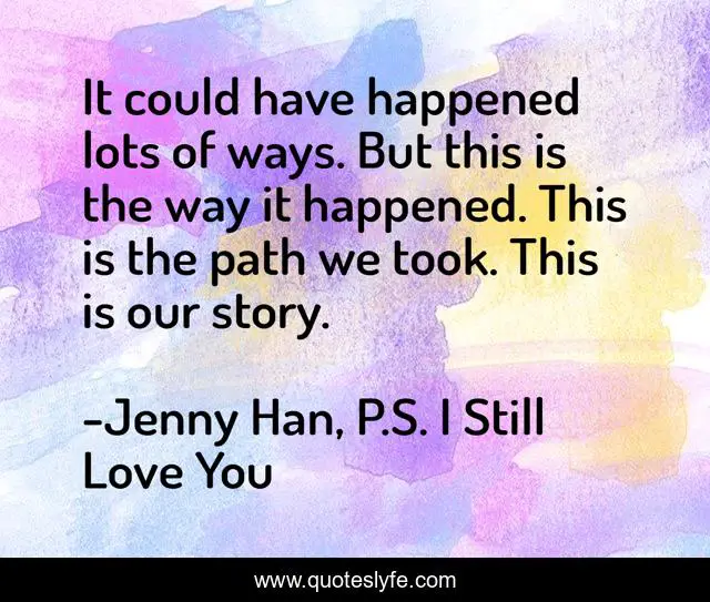 This page presents the quote "It could have happened lots of ways. But this is the way it happened. This is the path we took. This is our story.". Author of this quote is Jenny Han, P.S. I Still Love You. This quote is about story, jenny-han, love, love-story, p-s-i-still-love-you, affection,.