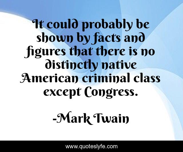 This page presents the quote "It could probably be shown by facts and figures that there is no distinctly native American criminal class except Congress.". Author of this quote is Mark Twain. This quote is about america, corruption, congress, government,.