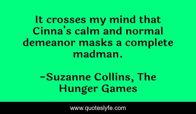 This page presents the quote "It crosses my mind that Cinna's calm and normal demeanor masks a complete madman.". Author of this quote is Suzanne Collins, The Hunger Games. .