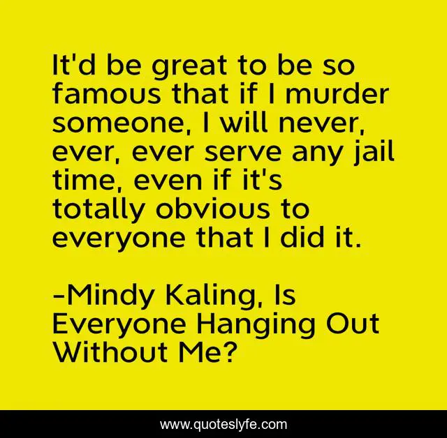 This page presents the quote "It'd be great to be so famous that if I murder someone, I will never, ever, ever serve any jail time, even if it's totally obvious to everyone that I did it.". Author of this quote is Mindy Kaling, Is Everyone Hanging Out Without Me?. This quote is about murder, humor, popularity, mindy, kaling, comedy, fame,.