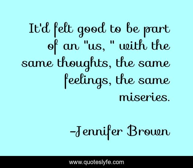 This page presents the quote "It'd felt good to be part of an "us, " with the same thoughts, the same feelings, the same miseries.". Author of this quote is Jennifer Brown. This quote is about teen-romance, teenage-love, us, misery,.