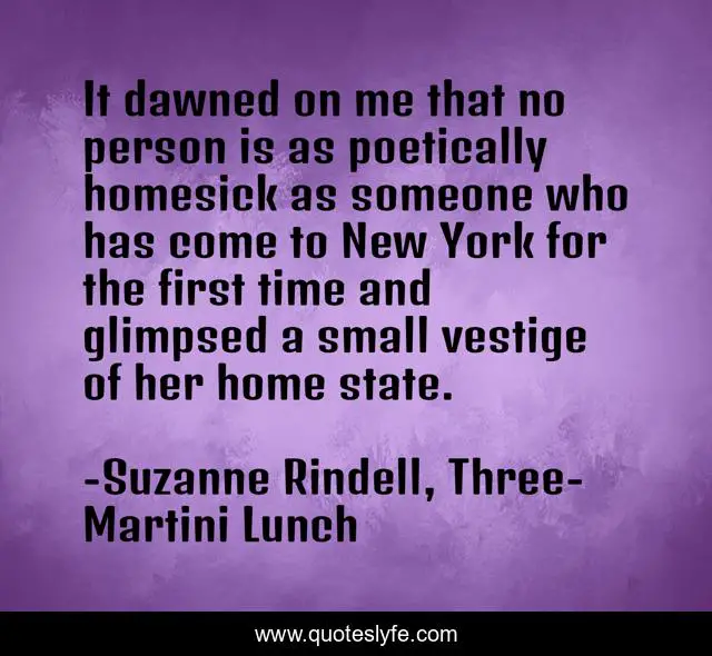 This page presents the quote "It dawned on me that no person is as poetically homesick as someone who has come to New York for the first time and glimpsed a small vestige of her home state.". Author of this quote is Suzanne Rindell, Three-Martini Lunch. This quote is about new-york-city, homesick,.