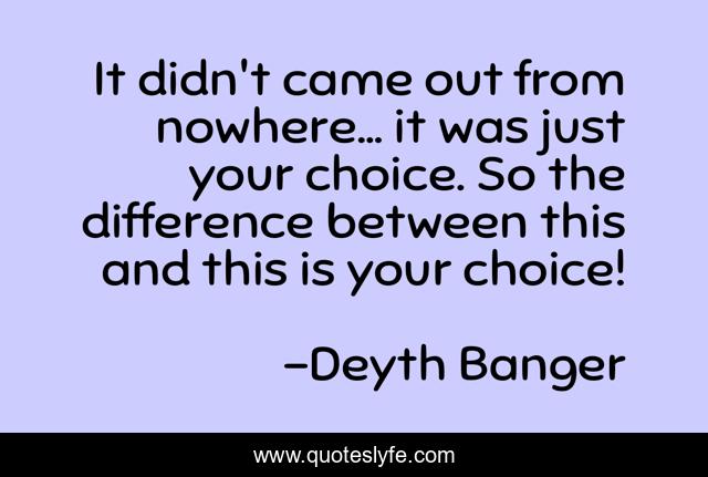 This page presents the quote "It didn't came out from nowhere... it was just your choice. So the difference between this and this is your choice!". Author of this quote is Deyth Banger. This quote is about didn-t, choice, nowhere, came, out,.