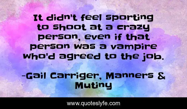 This page presents the quote "It didn't feel sporting to shoot at a crazy person, even if that person was a vampire who'd agreed to the job.". Author of this quote is Gail Carriger, Manners & Mutiny. This quote is about finishing-school, crazy-person, humor, gail-carriger, vampire, sophronia, manners-mutiny, professor-braithwope, mgg,.