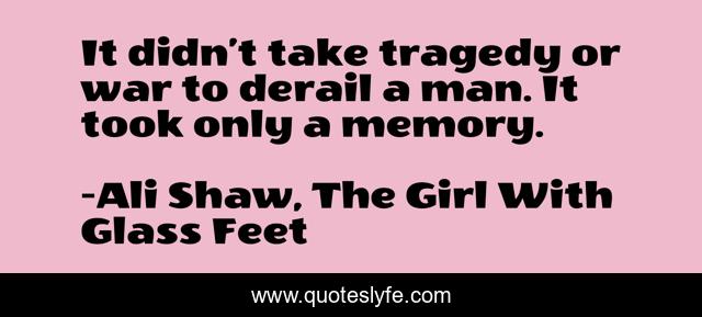This page presents the quote "It didn’t take tragedy or war to derail a man. It took only a memory.". Author of this quote is Ali Shaw, The Girl With Glass Feet. This quote is about life, tragedy, memory,.